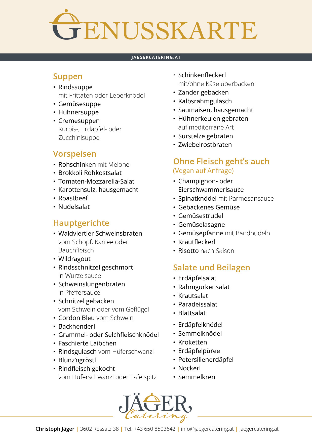 Ob herzhaft, vegetarisch oder traditionell – unser vielfältiges Angebot lässt keine Wünsche offen. Wählen Sie aus unseren Suppen, Vorspeisen, Hauptgerichten, Beilagen und Salaten oder lassen Sie sich von unseren Spezialitäten wie Jägers Grillhendlservice, Spanferkelservice oder Heurigenbuffet begeistern. Gerne stellen wir Ihnen ein maßgeschneidertes Menü zusammen – ganz nach Ihrem Geschmack und passend zu Ihrem Anlass!